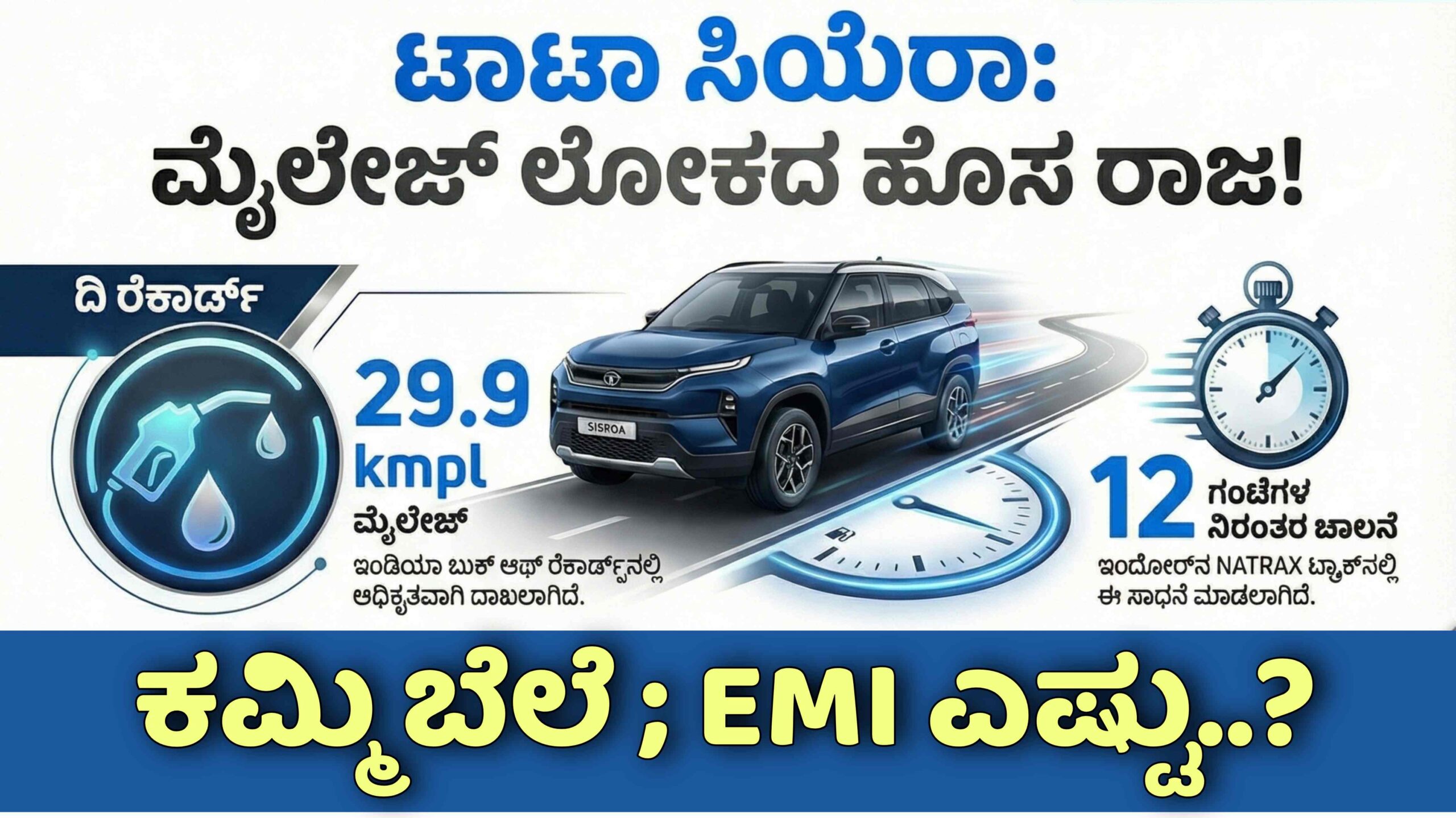 ಟಾಟಾ ಸಿಯೆರಾ ದಾಖಲೆ: ಲೀಟರ್ಗೆ ಬರೋಬ್ಬರಿ 29.9 ಕಿ.ಮೀ ಮೈಲೇಜ್! ಬೆಲೆ ಮತ್ತು ಲೋನ್ ಲೆಕ್ಕಾಚಾರ ಇಲ್ಲಿದೆ.