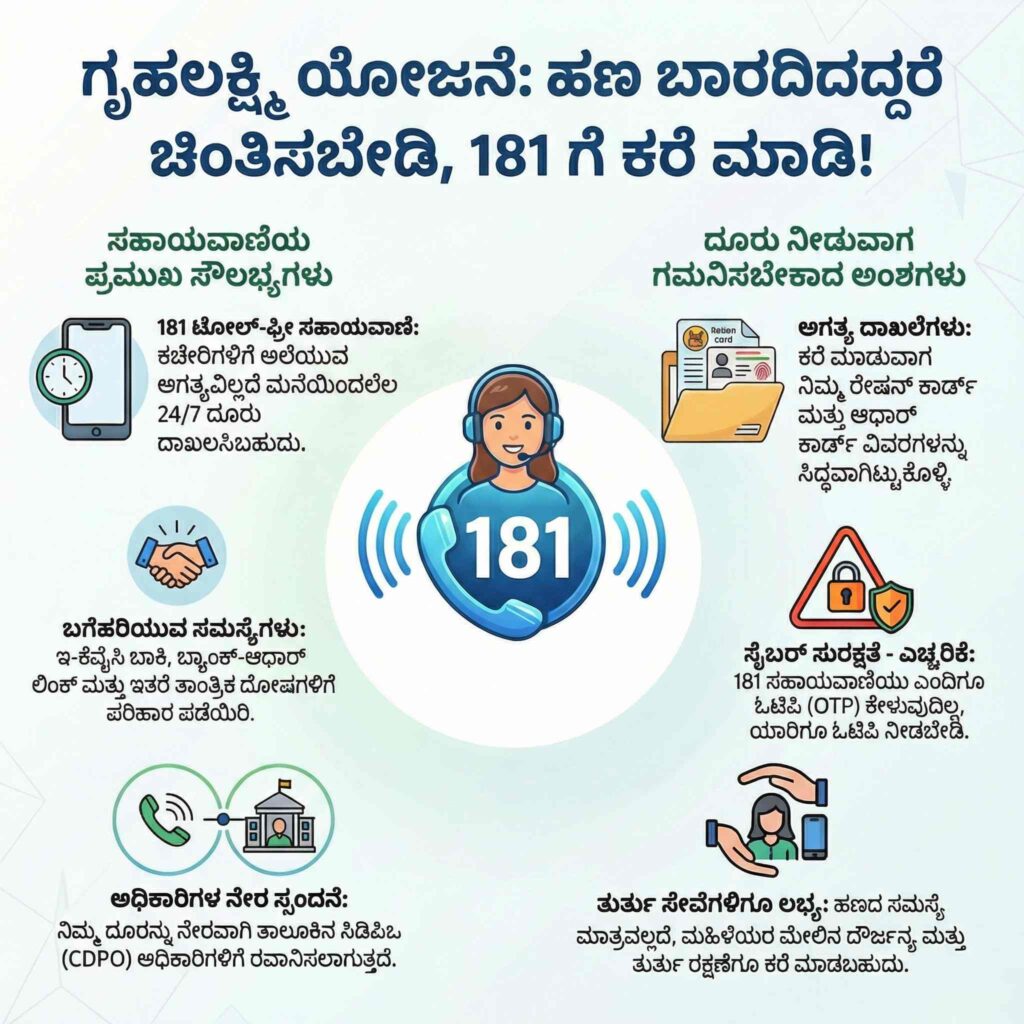 - ಗೃಹಲಕ್ಷ್ಮಿ ₹2,000 ಹಣ ಬಂದಿಲ್ಲವೇ? 181 ಸಹಾಯವಾಣಿಗೆ ಕರೆ ಮಾಡಿ.