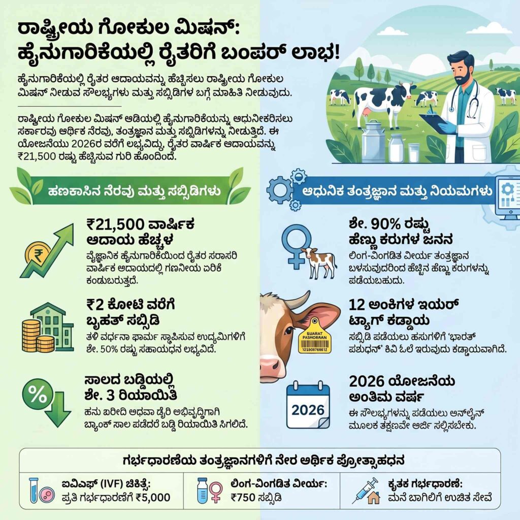 ಕೇಂದ್ರ ಸರ್ಕಾರವು ರೈತರ ಜೇಬು ತುಂಬಿಸಲು ಮತ್ತು ಹಸುಗಳ ತಳಿ ಸುಧಾರಣೆ ಮಾಡಲು ‘ರಾಷ್ಟ್ರೀಯ ಗೋಕುಲ ಮಿಷನ್’ (National Gokul Mission) ಎಂಬ ಭರ್ಜರಿ ಯೋಜನೆಯನ್ನು ಜಾರಿಗೆ ತಂದಿದೆ. ಕೇವಲ ಹಾಲು ಕರೆಯುವುದಷ್ಟೇ ಅಲ್ಲ, ಮಾಡರ್ನ್ ಟೆಕ್ನಾಲಜಿ ಬಳಸಿ ರೈತರು ವಾರ್ಷಿಕ ಕನಿಷ್ಠ ₹21,500 ರಷ್ಟು ಹೆಚ್ಚಿನ ಆದಾಯ ಗಳಿಸುವುದು ಹೇಗೆ? ಇಲ್ಲಿದೆ ಕಂಪ್ಲೀಟ್ ಡೀಟೇಲ್ಸ್.
