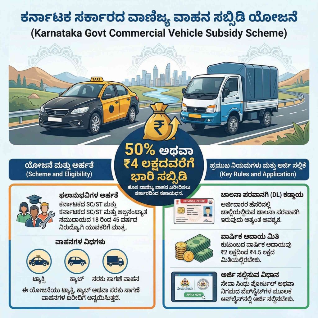 ಹೌದು, ನೀವು ಟ್ಯಾಕ್ಸಿ ಅಥವಾ ಸರಕು ಸಾಗಣೆ ವಾಹನ (Goods Vehicle) ಖರೀದಿಸಲು ಯೋಚಿಸುತ್ತಿದ್ದರೆ, ಈಗ ಸರ್ಕಾರವೇ ನಿಮಗೆ ದೊಡ್ಡ ಮೊತ್ತದ ಧನಸಹಾಯ ನೀಡುತ್ತಿದೆ. ‘ಸ್ವಾವಲಂಬಿ ಸಾರಥಿ’ ಯೋಜನೆಯ ಮೂಲಕ ನಿಮ್ಮ ಕನಸನ್ನು ನನಸು ಮಾಡಿಕೊಳ್ಳುವುದು ಈಗ ಸುಲಭ.