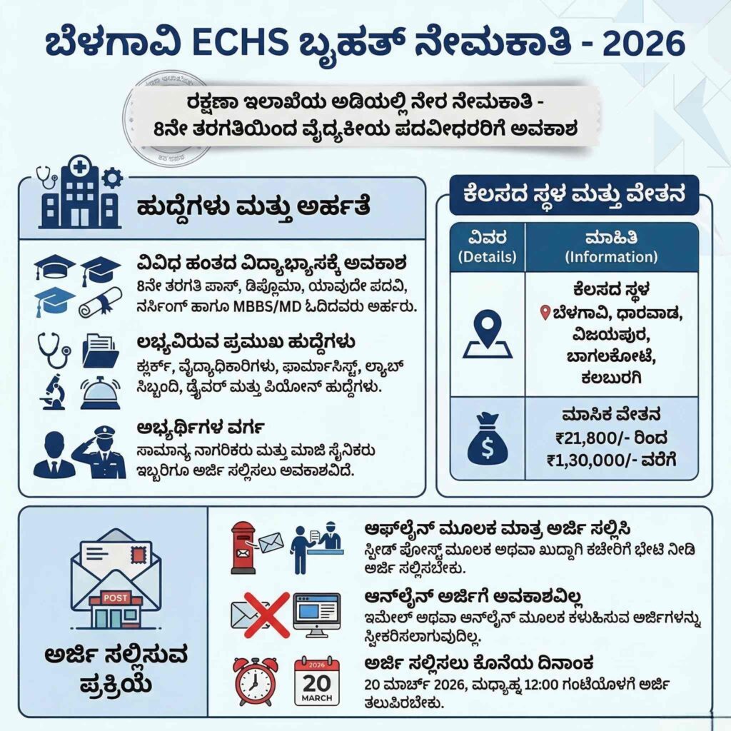 ಬೆಳಗಾವಿ ಸೇರಿದಂತೆ ಉತ್ತರ ಕರ್ನಾಟಕದ ಪ್ರಮುಖ ಜಿಲ್ಲೆಗಳಲ್ಲಿ ಖಾಲಿ ಇರುವ ಹುದ್ದೆಗಳನ್ನು ಭರ್ತಿ ಮಾಡಲು ‘ಮಾಜಿ ಸೈನಿಕರ ಕೊಡುಗೆ ಆರೋಗ್ಯ ಯೋಜನೆ’ (ECHS) ಅಧಿಕೃತ ಅಧಿಸೂಚನೆ ಹೊರಡಿಸಿದೆ. ಡಾಕ್ಟರ್, ಕ್ಲರ್ಕ್ನಿಂದ ಹಿಡಿದು ಡ್ರೈವರ್, ಪಿಯೋನ್ ವರೆಗೂ ಇಲ್ಲಿ ಭಾರಿ ನೇಮಕಾತಿ ನಡೆಯುತ್ತಿದೆ.